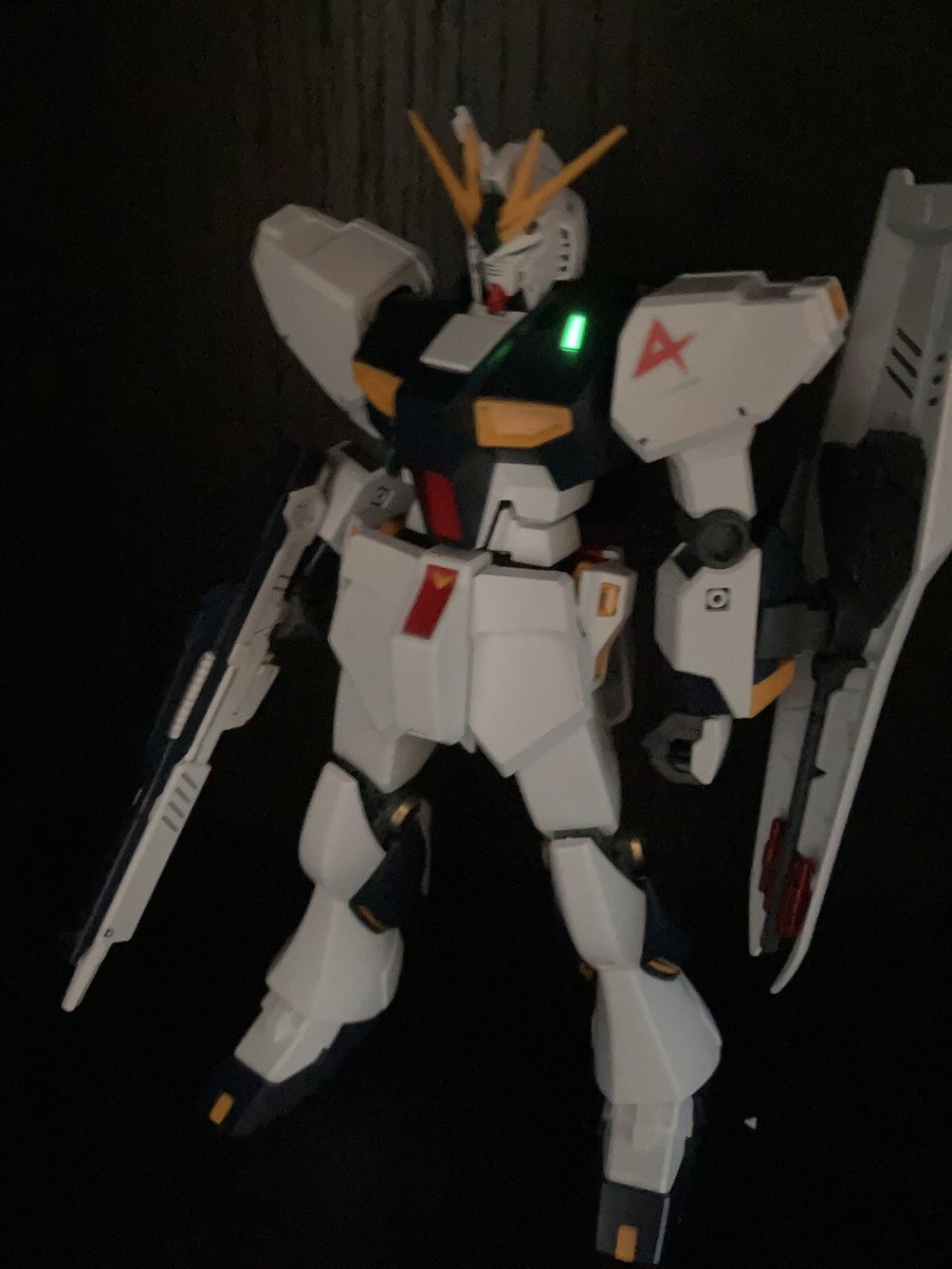 EGνガンダム 墨入れとデカール貼り(付属の物を使用)、バーニアなどの部分塗装を行いました 胸部のセンサーには蓄光シールを貼り付けているので光に当てた後暗闇に持っていくと光ります。(4枚目) #ガンプラ #ガンプラ好きと繋がりたい #ガンプラの画像を貼るとRTされると聞いて #νガンダム #EGνガンダム