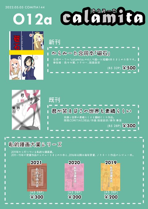【COMITIA144】O12a「calamita」お品書き 久々に評論ではないジャンルです。既刊は数年前の本。評論本は少なめ。 当日はよろしくお願いしますっ! 新刊サンプルはこちら↓ twitter.com/MafMof_D/statu… twitter.com/MafMof_D/statu… twitter.com/MafMof_D/statu… twitter.com/MafMof_D/statu… 新刊情報はこちら↓ twitter.com/MafMof_D/statu…