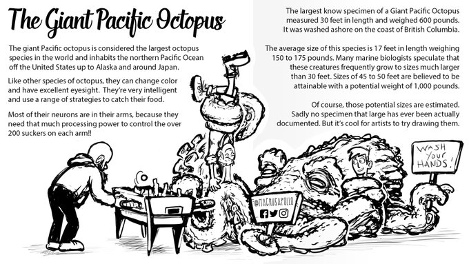 Combining the #SixFanarts tweets of @cmykara (@TheKrattBros) & @rudyrichter (Magnus vs a ROCtopus) I offer a #FactoidFriday drawing page of Giant Pacific Octopus for everyone to enjoy. There will be a higher res of this on my Patreon page. (Patrons get the access a day early)