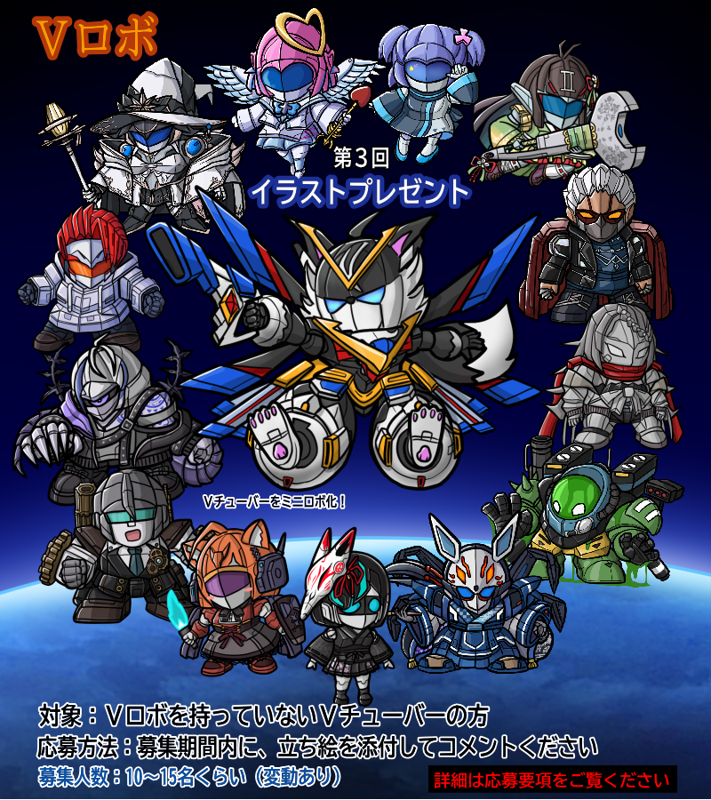 Vロボのイラストプレゼント企画、3回目の募集です! Vtuberさんをイメージしたロボ絵を真穂加のママが描きます。応募対象は、Vロボを持ってないVtuberさん。 希望の方はコメントをどうぞ!(立ち絵必須です) 締め切りは1月12日。※応募者多数の場合は抽選 #イラスト企画 #Vtuberさんと繋がりたい
