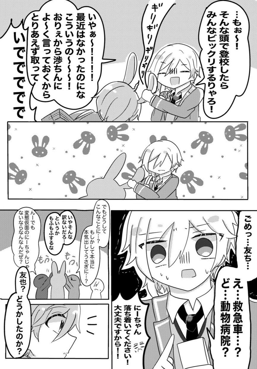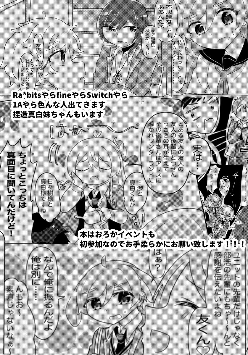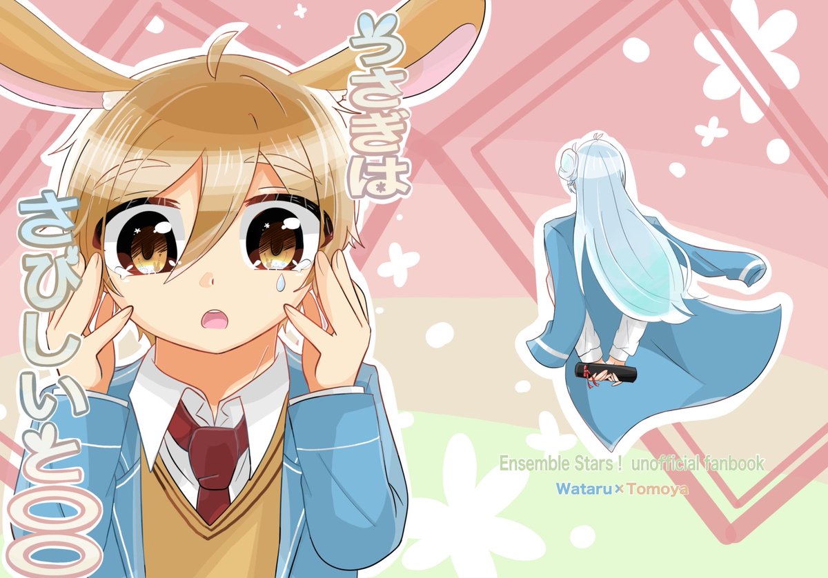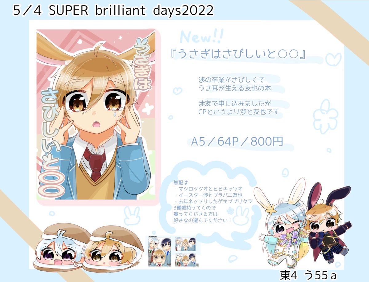 【🕊5/4ブリデ🐇】 東4ホール う55a 『うさぎはさびしいと○○』 B5 64P 値段まだ決めてないです!🙇 通販は検討中です! 渉さんの卒業が寂しくてうさ耳が生えちゃう友也くんの本です! 支部サンプル→#pixiv pixiv.net/artworks/97840… ツリーに部数アンケあります🙇