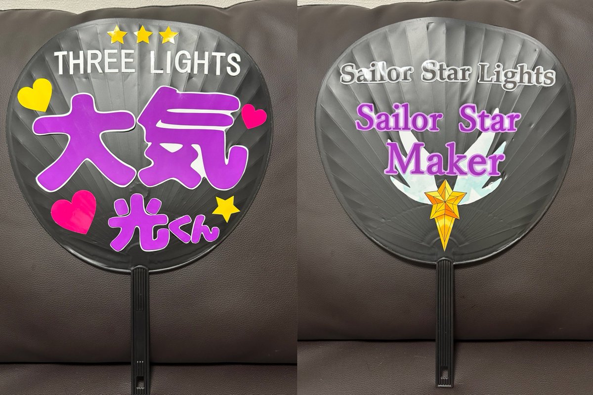スリーライツしてきたよー☺️🫶🙌 うちわとインカムは星野が作ってくれた👏✨ 2人とも早く変身しようぜ!! #アコスタ池袋