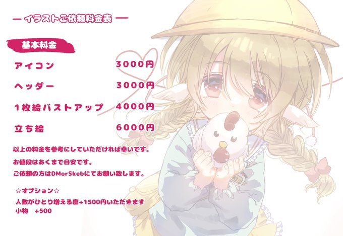 7 17 【固定用】 ずっと作りたかったイラスト有償ご依頼の料金表を作りました。 アイコンやオフの名札イラスト依頼も募集中です! お気軽にご相談ください、お待ちしています🙌 #イラスト依頼 #有償依頼募集中 22/07/11 14:09