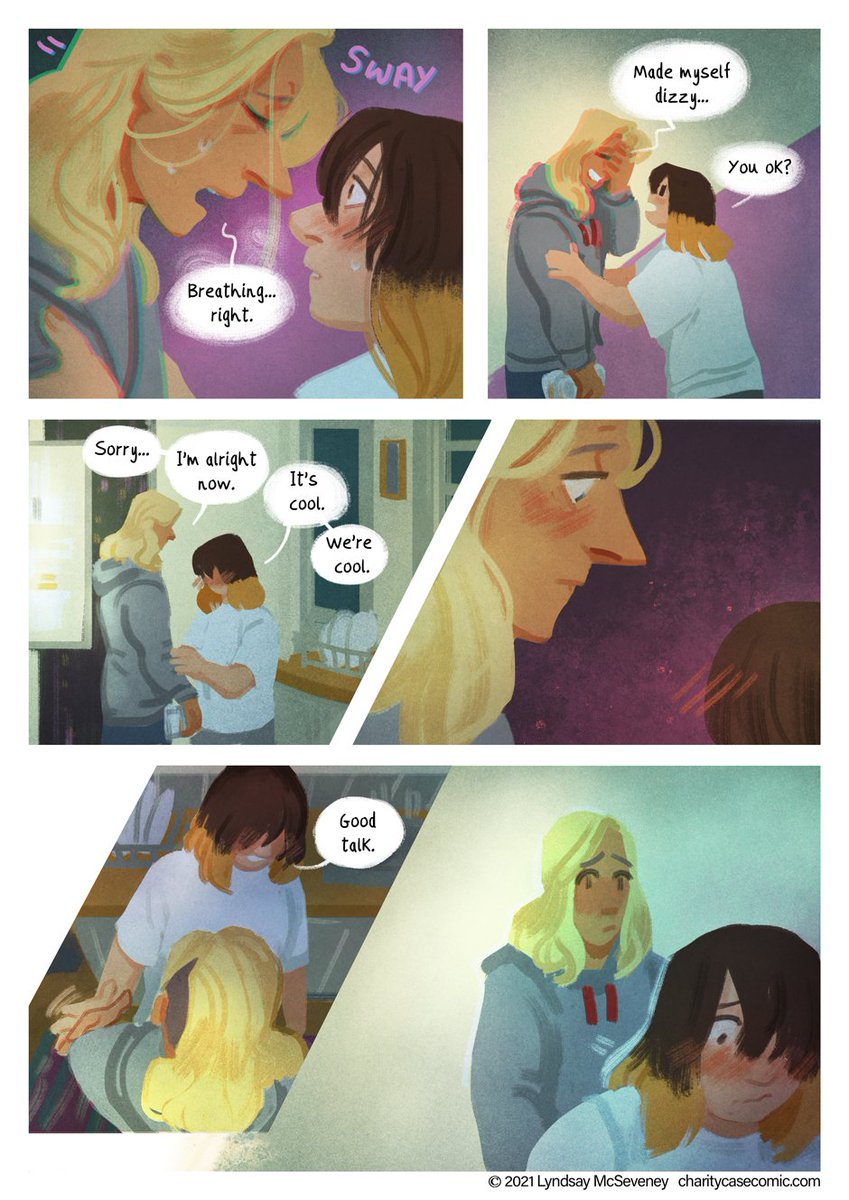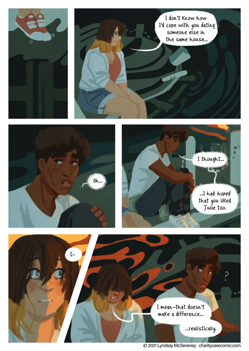 It's #webcomicday! I make Charity Case, a vibrant polyamorous slow burn. ⭐️Aspiring musician Julien finds himself relying on the charity of others to get his life back together, but the feelings he’s developing for his new housemates threaten to tear it all apart.⭐️🏳️⚧️🏳️🌈