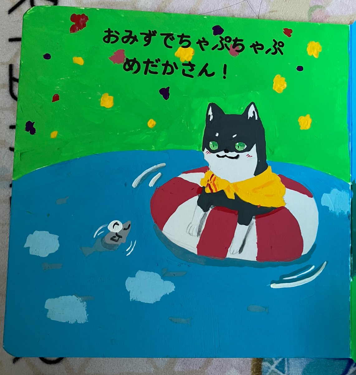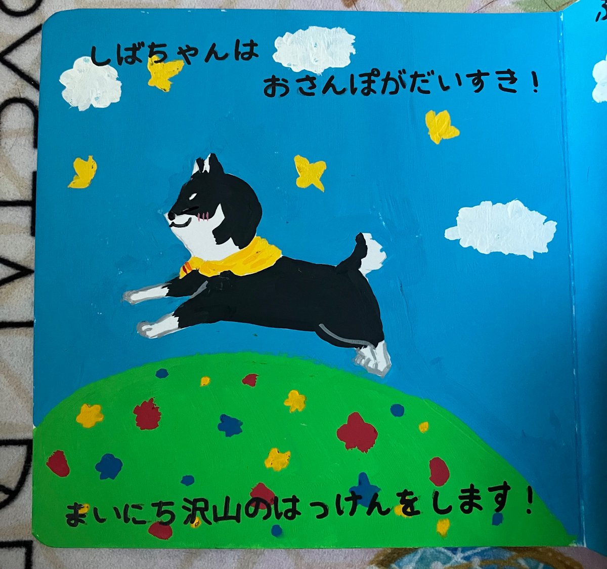 56 401 #しばのドッグタグ アナログであまり綺麗ではありませんが……美術の授業で絵本を作る課題があり、しばちゃんの絵本を描かせていただきました!(4/9) 23/05/04 17:33