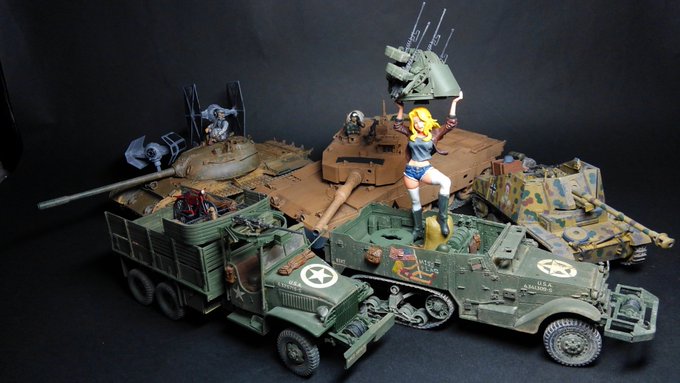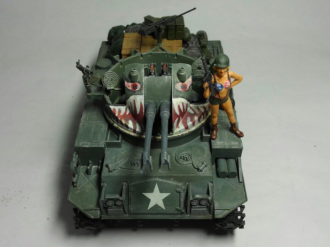 タミヤ 1/35 M42 ダスター 完成です。 ベトナム戦争辺りを想定して製作しました。 シャークマウスは手書きです。 良く見たら左右で口の大きさ違う....... 米軍らしく荷物増し増しにしました。 4月最後の完成品です。 #タミヤ #今月作ったプラモ晒そうぜ