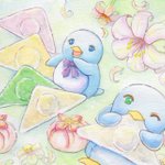 8 61 ☆ 手描きの水彩画☆ 食いしん坊ペンギンさん、八つ橋にかぶりつく! 描いたのは三角と巾着袋型。 他にも花や星があって、味も抹茶、イチゴ、チョコなど種類豊富になってる! #オリジナル #アナログ #水彩 #動物 #ペンギン #イラスト #和菓子 #スイーツ 22/10/02 10:06
