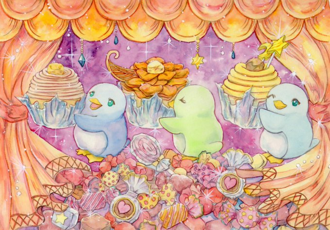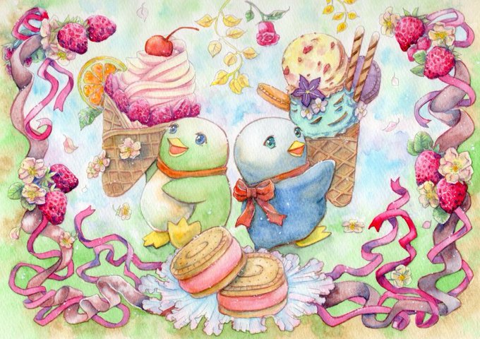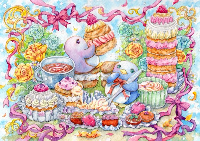 8 52 #今月描いた絵を晒そう 手描きの水彩画☆ 食いしん坊ペンギンとスイーツ! お菓子で出来ている世界へ行きたい。 水彩紙ホワイトワトソン、ヴィフアール 水彩絵具ホルベイン、クサカベ、レンブラントなど #オリジナル #アナログ #水彩 #動物 #ペンギン #イラスト 23/01/29 20:27