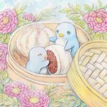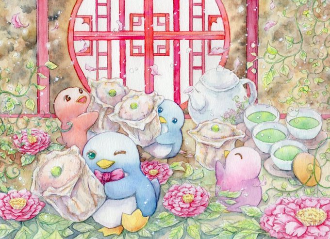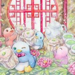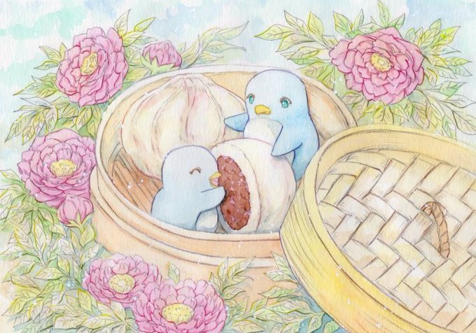 7 64 ☆ 手描きの水彩画☆ ペンギン☆しゅうまい♪ 中華の蒸し料理。 お茶もあるよ~! 晩酌にもいいよ~! 水彩紙ヴィフアール中目 #オリジナル #アナログ #水彩 #動物 #ペンギン #イラスト 22/10/23 21:16