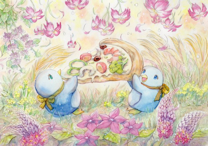 3 39 ☆ 手描きの水彩画☆ ペンギンとシーフード・ピッツァ! 乗ってる具はね、 チーズとエビと輪切りピーマンと イカとブロッコリーとか 何か。 陽気にピッツァ! #オリジナル #アナログ #水彩 #動物 #ペンギン #イラスト 22/10/30 20:20