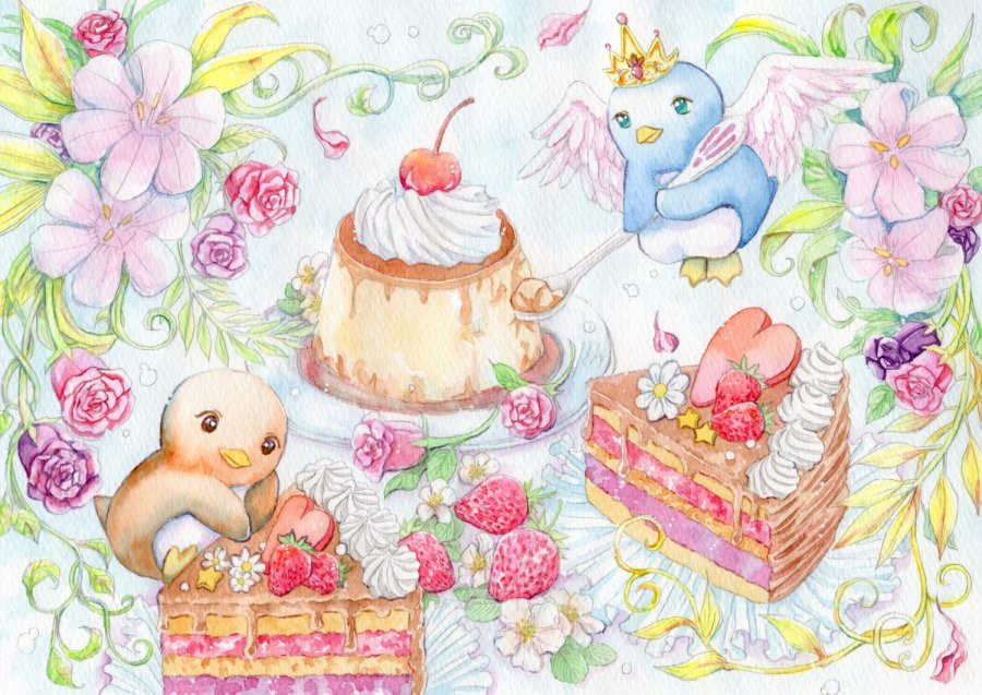 ☆ 手描きの水彩画☆ ペンギン☆プリン&チョコケーキ 薔薇はいいね。 豪華な感じになるの。 水彩紙ホワイトワトソン #オリジナル #アナログ #水彩 #動物 #ペンギン #イラスト