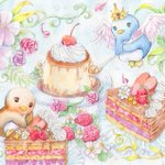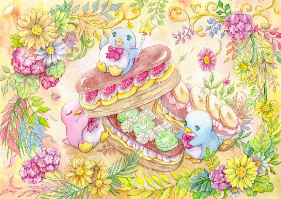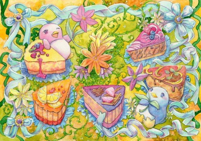 3 27 ☆ 手描きの水彩画☆ 食いしん坊ペンギンたちと はい、チーズ! 絵面が寂しくなると思い、色々デコレーションしたチーズケーキを描きました。 水彩紙ヴィフアール #オリジナル #アナログ #水彩 #動物 #ペンギン #イラスト 23/02/19 11:01