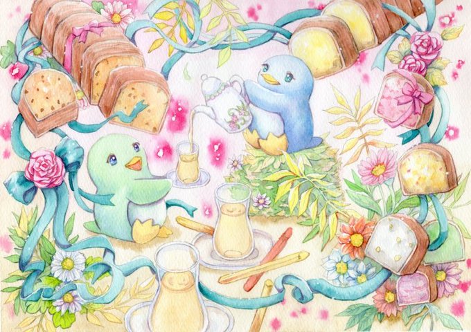 3 28 ☆ 手描きの水彩画☆ ペンギン☆チャイ&パウンドケーキ もぐもぐタイムで幸せ。 水彩紙ホワイトワトソン #オリジナル #アナログ #水彩 #動物 #ペンギン #イラスト 22/12/11 11:01