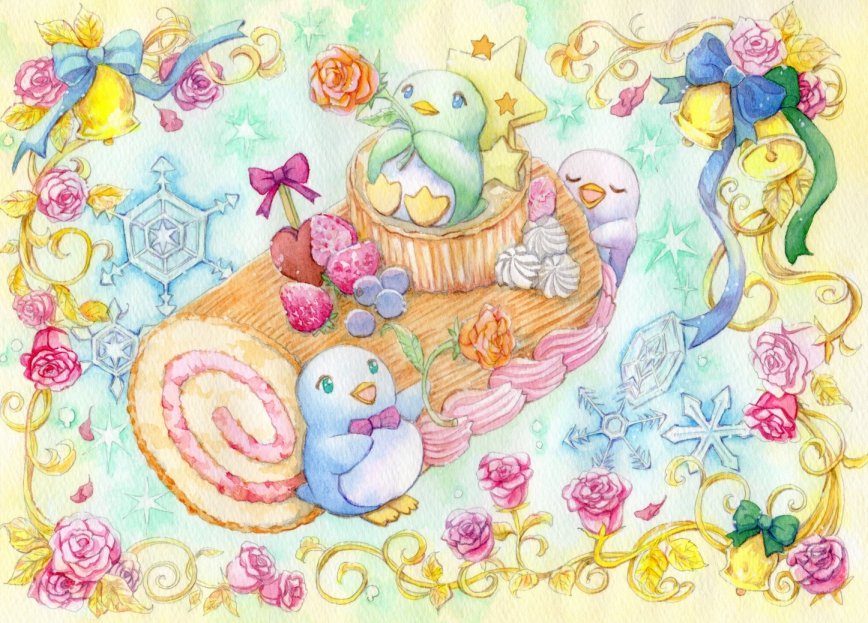 3 25 ☆ 手描きの水彩画☆ ペンギン☆プリン&チョコケーキ 薔薇はいいね。 豪華な感じになるの。 水彩紙ホワイトワトソン #オリジナル #アナログ #水彩 #動物 #ペンギン #イラスト 22/11/20 22:16