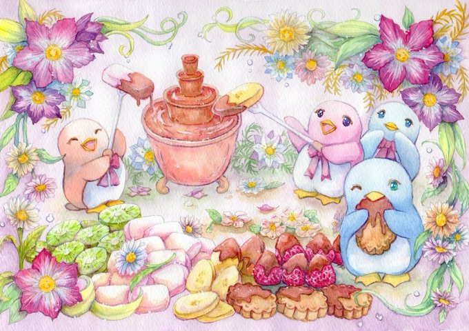 3 27 ☆ 手描きの水彩画☆ ペンギン☆とろとろチョコフォンデュ! 温かく溶けてるのが美味しい。 水彩紙ホワイトワトソン 水彩絵具ホルベイン、W&N #オリジナル #アナログ #水彩 #動物 #ペンギン #イラスト 23/02/05 11:01