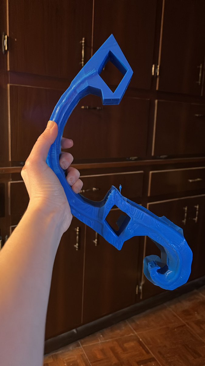 Attempt number 3 on the blade. The first print was a little too thin and the support mechanism I had in mind didn’t do that well, second came out decent but was missing some stuff and the print got warped. So 3rd times the charm! #3dprinting #3dmodeling #cosplay #wip