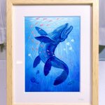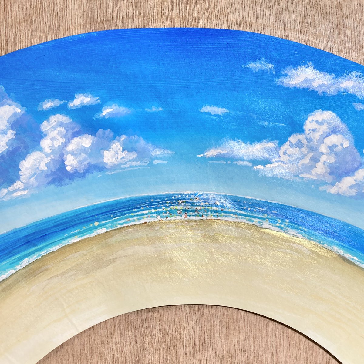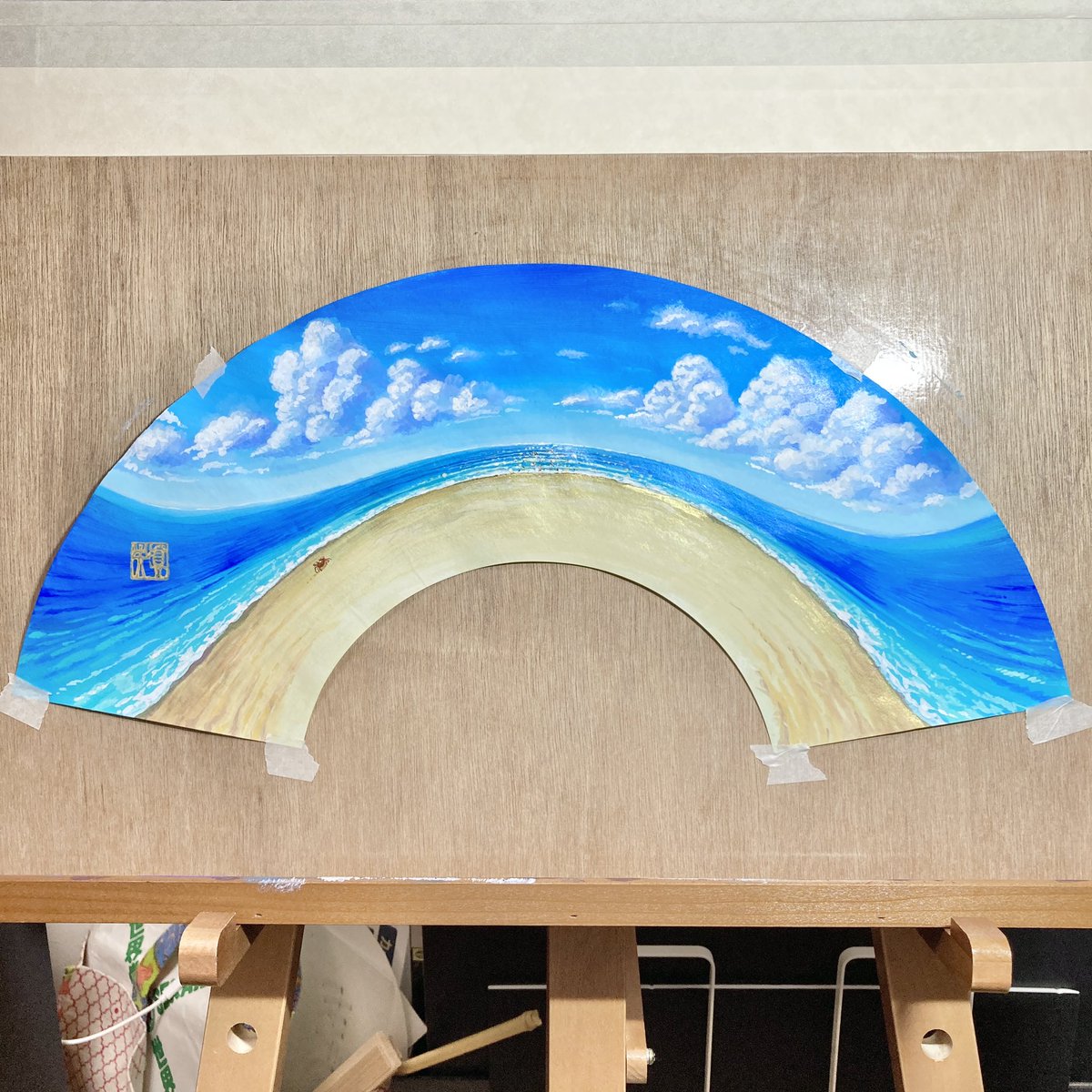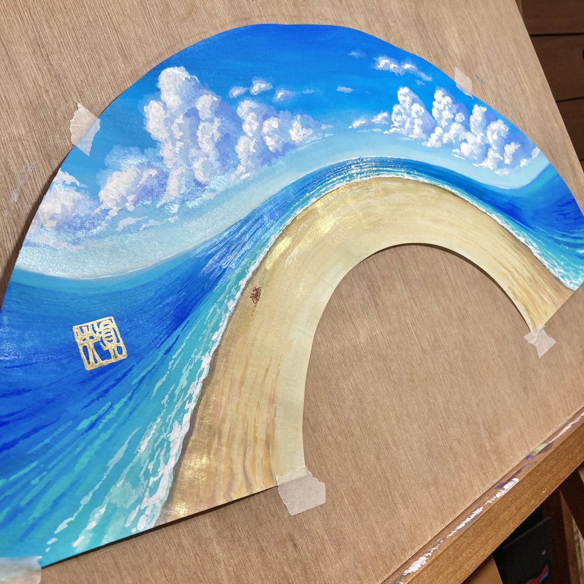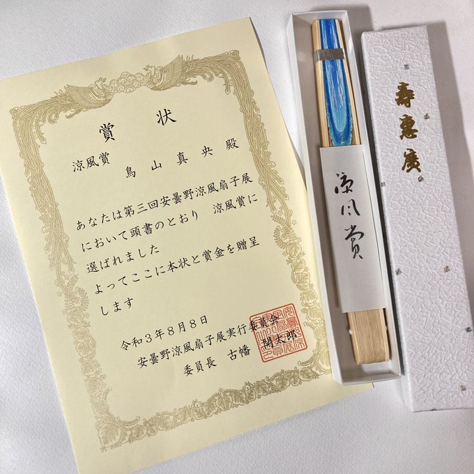 受賞作品が返ってきました! 実物は見応えあります!✨ #安曇野涼風扇子展 #みんなで楽しむTwitter展覧会 #真夏の芸術納涼祭2021 #青を見て体感温度を下げる #海 #水彩画 #イラスト