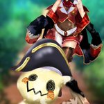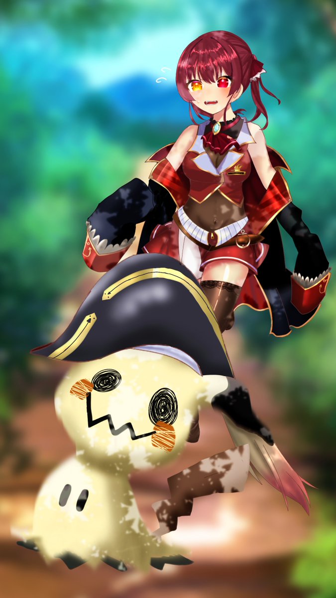 「帽子を盗って逃走するミミッキュを追いかける船長の図」です。 初めてちゃんと船長描きました。 #マリンのお宝 #ホロライブ #宝鐘マリン