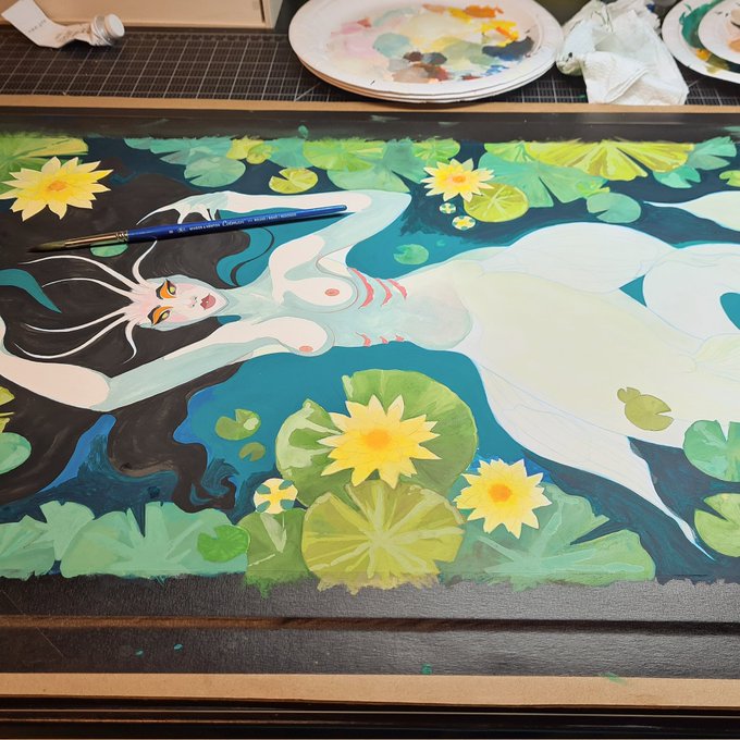 🧜♀️Waterlily🧜♀️ I am very happy and proud with how this piece turned out! Approximately 35 x 75 cm Watercolor, acryla gouache, regular gouache and pencil on Illustration board. #mermay #mermaid #waterlily #mixedmediapainting