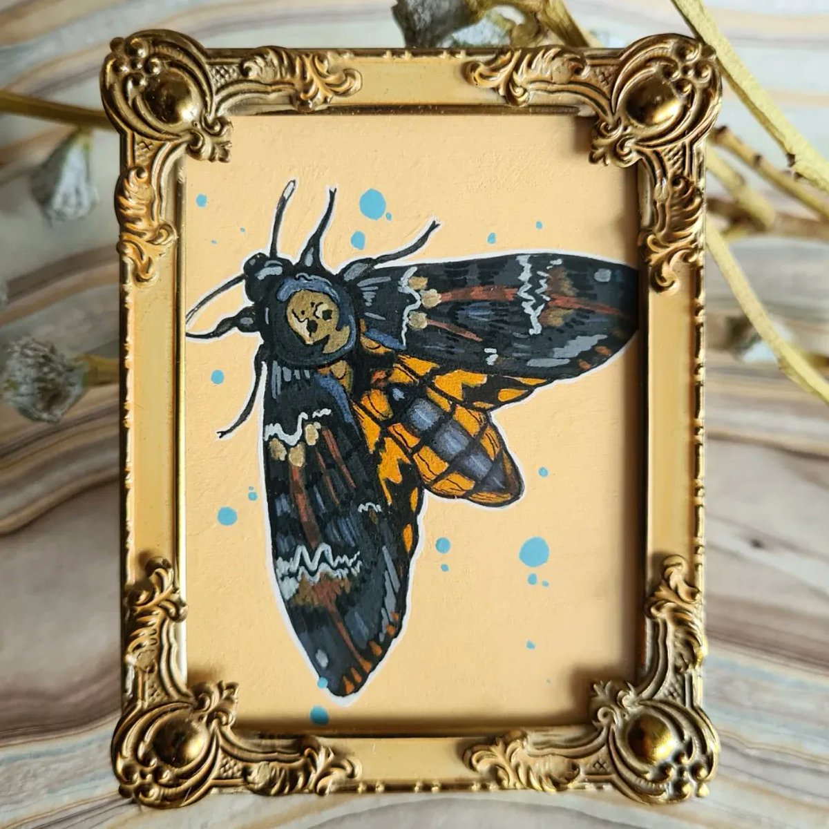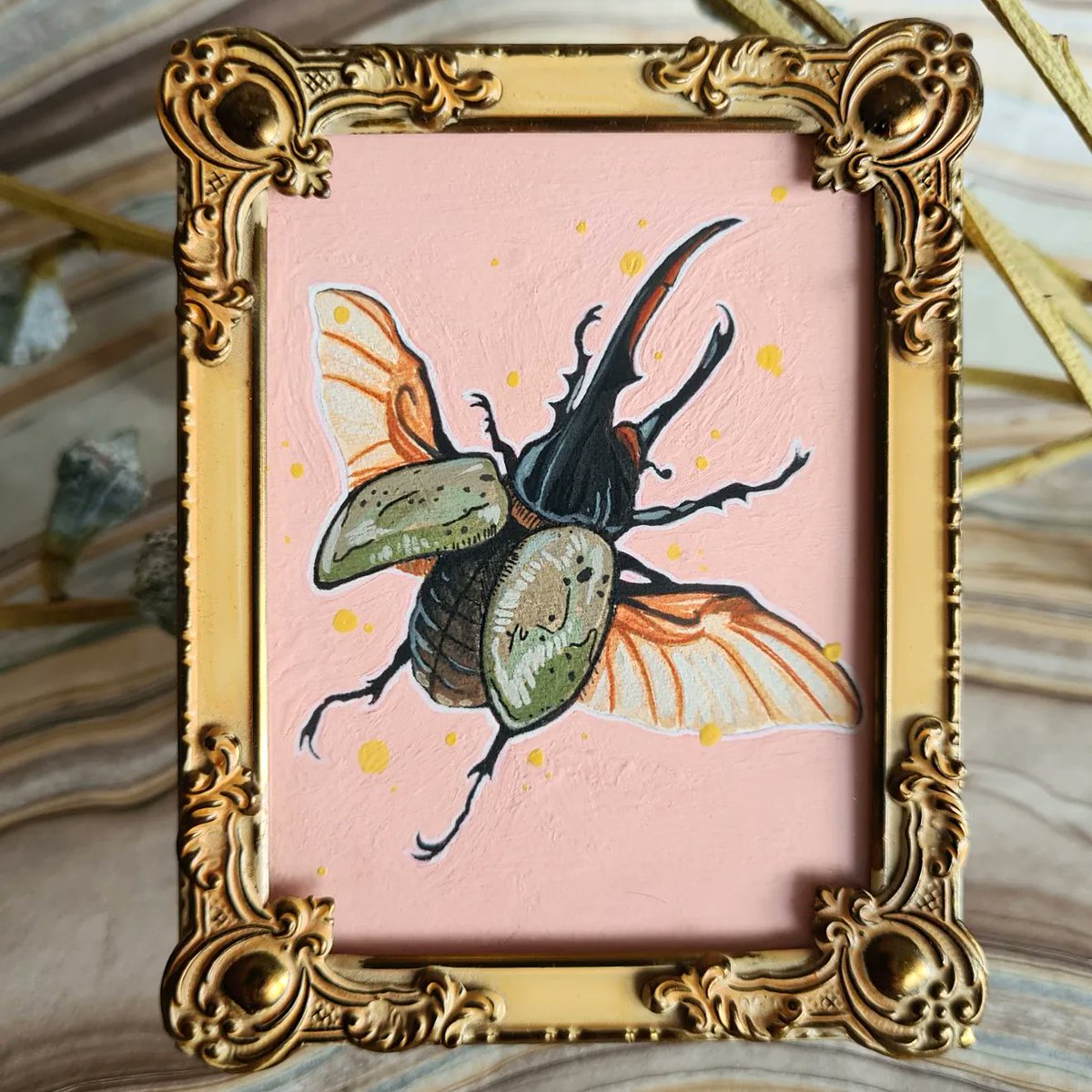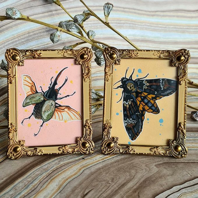 Some insects I painted inserted into tiny, vintage frames! Hercules beetle and deaths head hawkmoth. #artistsontwitter