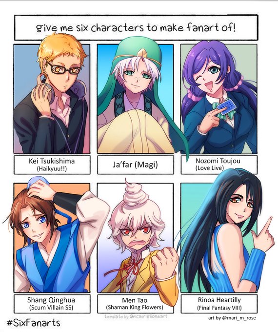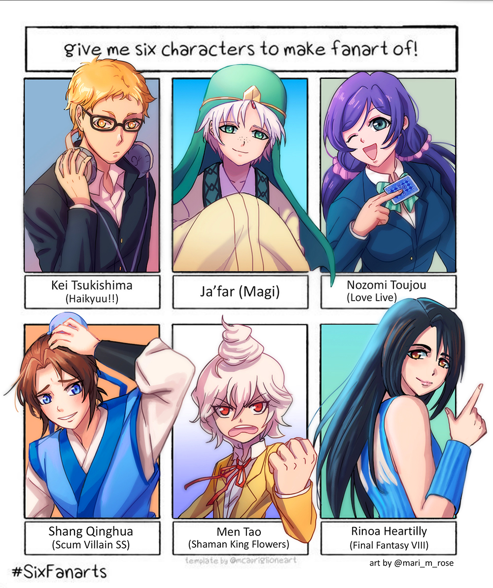 Took me so long.....also experimented a few coloring styles... This is part one, part two coming soon. Thanks for requesting these characters. #SixFanarts #haikyuufanart #magi #jafar #lovelive #ScumVillain #shamanking #FFVIII #rinoa