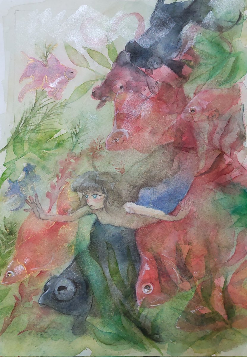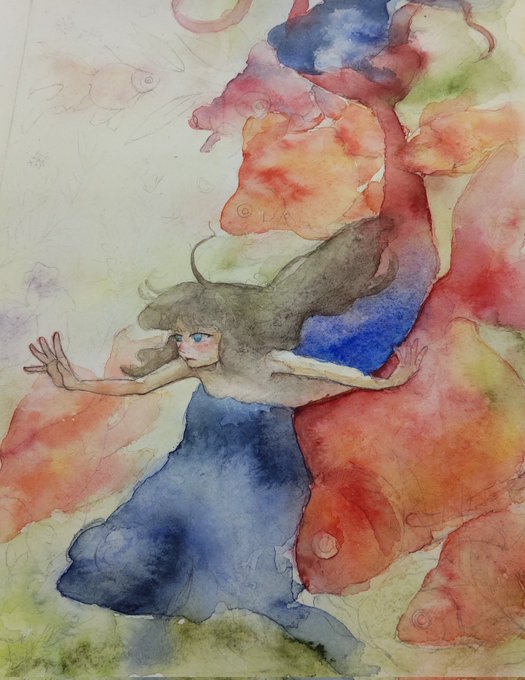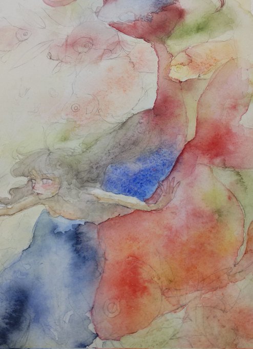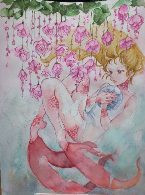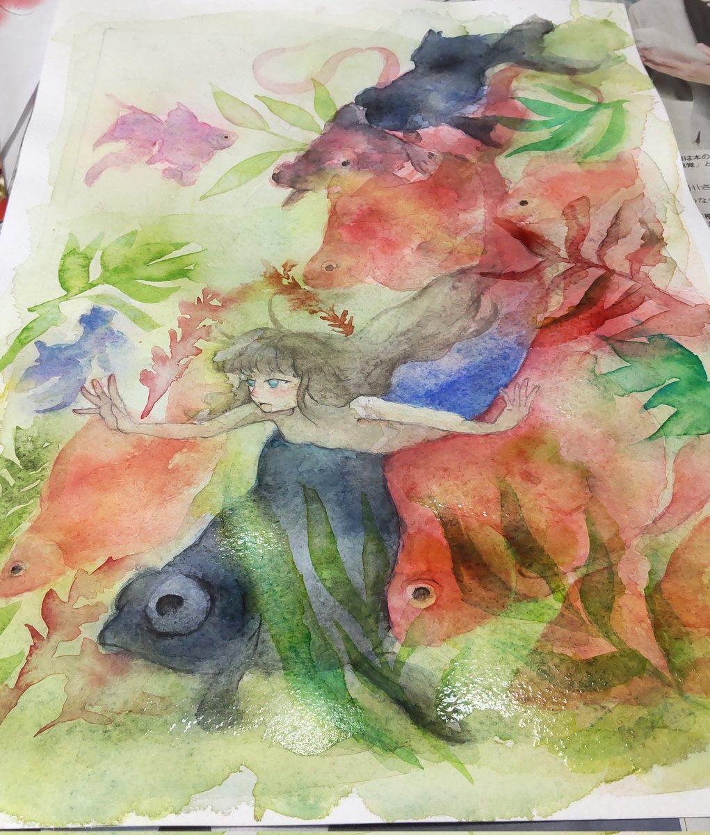 このイラスト手をつけました〜。人魚さんのバストがラフと比べて小さくなっていく🤣まあ特に意識してないのでいいですがwww これからキラキラ絵の具塗ったりホロを貼ったりして遊び倒してやります😆 #イラスト #イラストレーション #透明水彩イラスト #Illustration #watercolorIllustration
