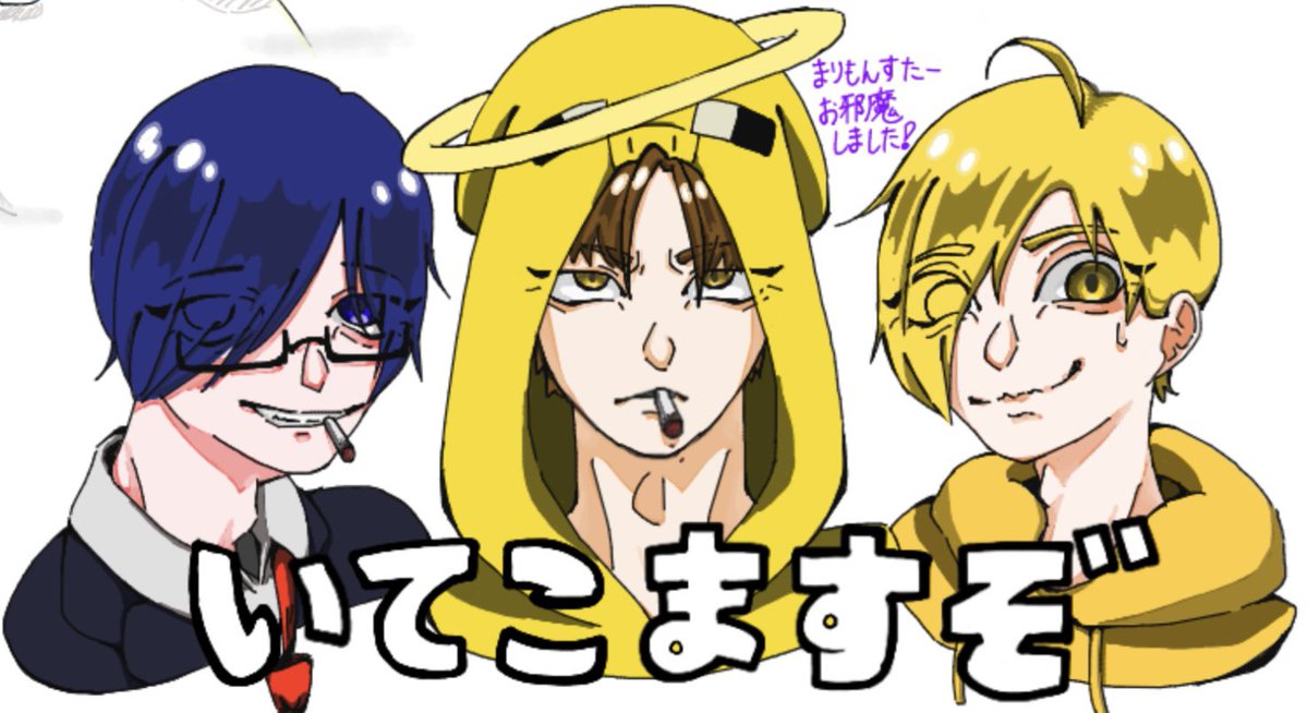 合作中に思い通りに描けなさすぎて、とんでもない方向へ飛んでしまったhtと、別の合作で集まるのを待ってる時に描いたos、sho。 (ちなみにshoがキッショって言ってる理由は、隣に優しい方がut「シャオチャン...」と書いてくれたからである。) #wrwrdFA #wrwrd絵描きさんと繋がりたい