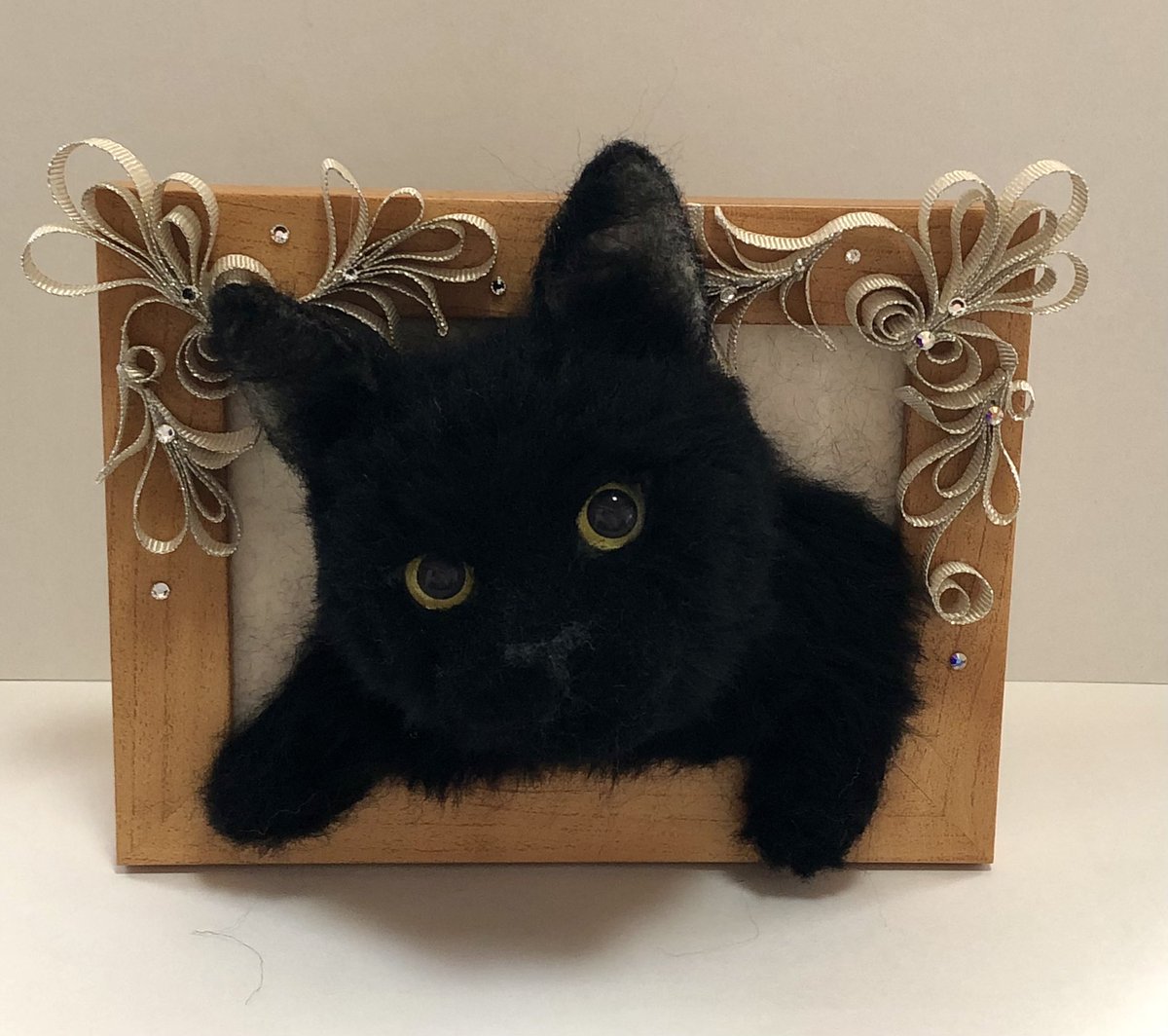 黒猫ちゃん シルバーのリボン額に入りました。今にも出てきそう⁉️ #羊毛フェルト #黒猫 #オーダー