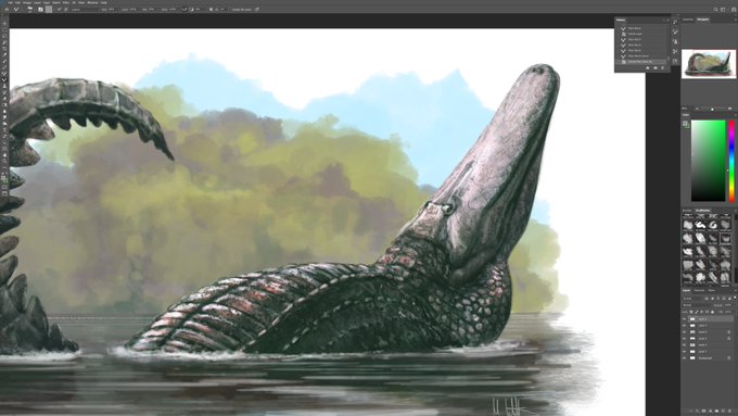 Digging back to 2018 for this week's #FossilFriday #paleoart: my mural of a hyper-busy Jurassic sea for Scarborough's Rotunda Museum. Rhomaelosaurus takes the starring role.