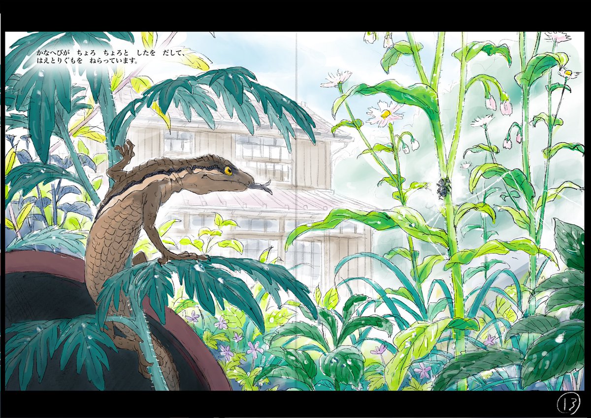 前後のページと合わせて考え、カナヘビを大きく入れる構図に決めました。