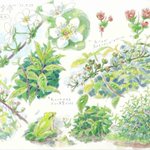 ヤマナシはこの絵ではピンクっぽく描いてますが、緑色っぽく描いてみた。花びらは本物はもう少しお椀状だったな… 絵本は虫たちが主役なので男の子の顔は見せないという選択もありましたが、やはり見えてた方がうれしいかなと。 ただ、水たまりに映った顔だったのでなかなか難しかった…