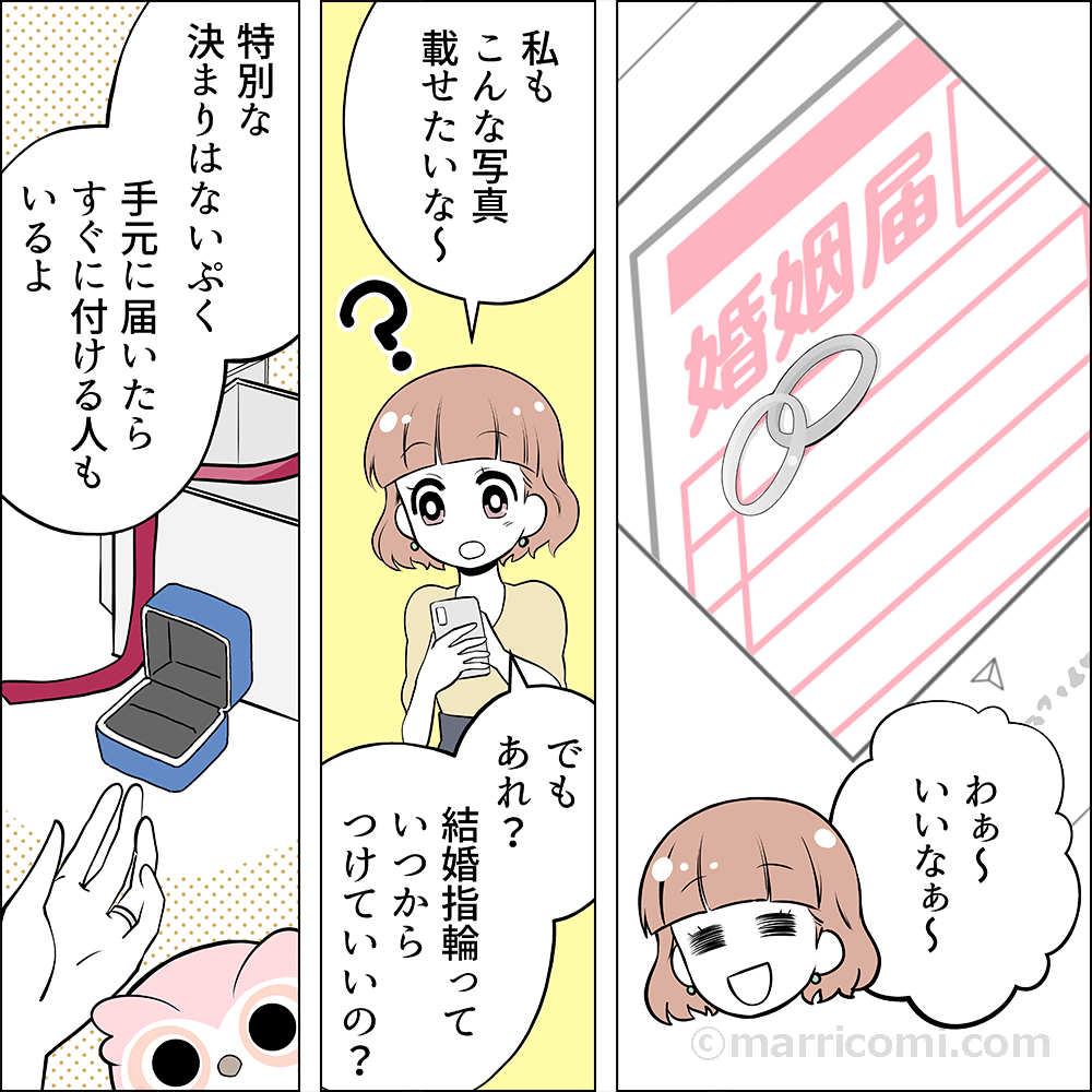 結婚指輪を購入したら、いつから身につけるのか迷っていますか?2人で決めたタイミングから身につけて大丈夫です。結婚式前でも、事前にクリーニングをしてもらえば綺麗な状態で指輪交換できますよ。 marricomi.com/wear-ring #漫画が読めるハッシュタグ