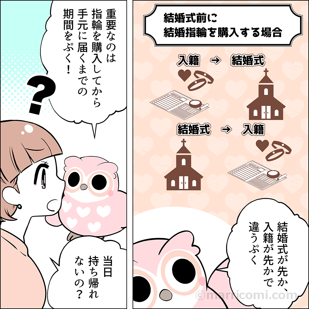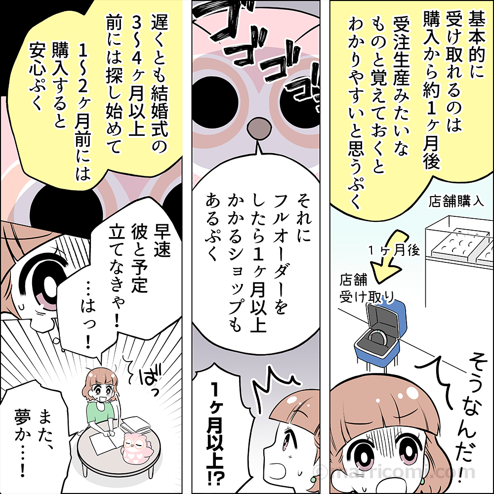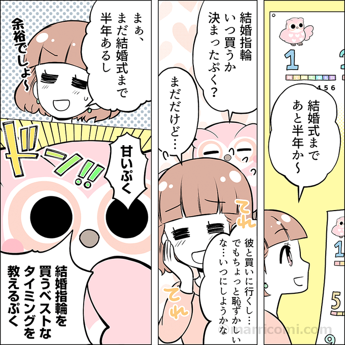 結婚指輪を探し始めるタイミングについてお困りですか?挙式を行う方であれば、挙式の1~2ヶ月前には自分の手元にある状態が望ましいので、挙式日程から3~4ヶ月以上前からは探し始めると安心! #漫画が読めるハッシュタグ #漫画