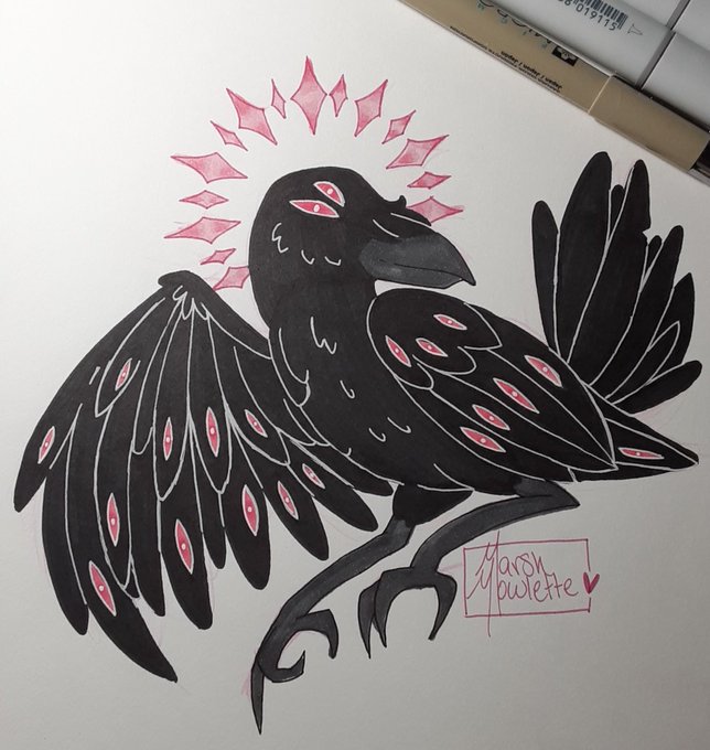 Day 2: Extra Eyes! Decided to go with an "angelic" raven with eyes on their wings. I'm curious on how much pink I can keep using before I can't find a way to work it in. #nahrinktober #inktober #raven