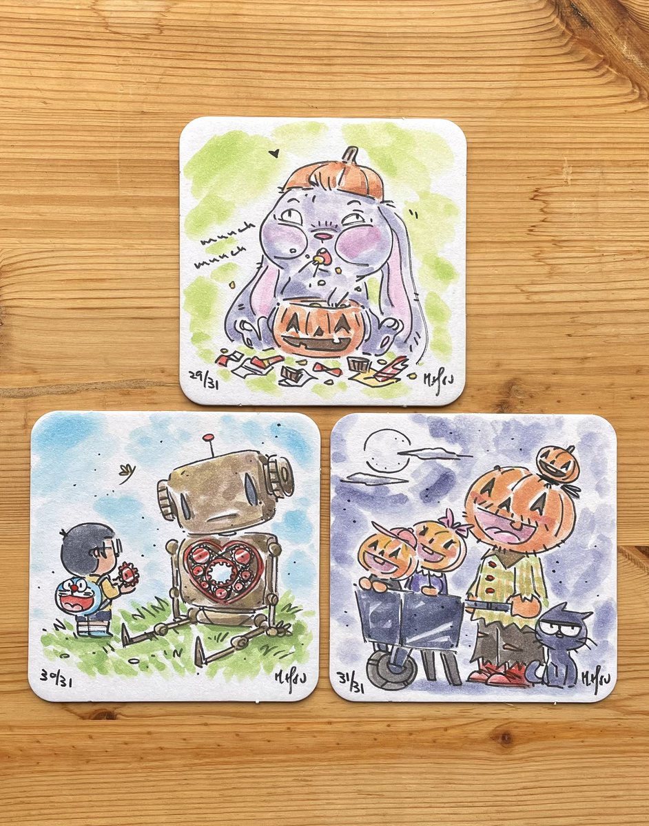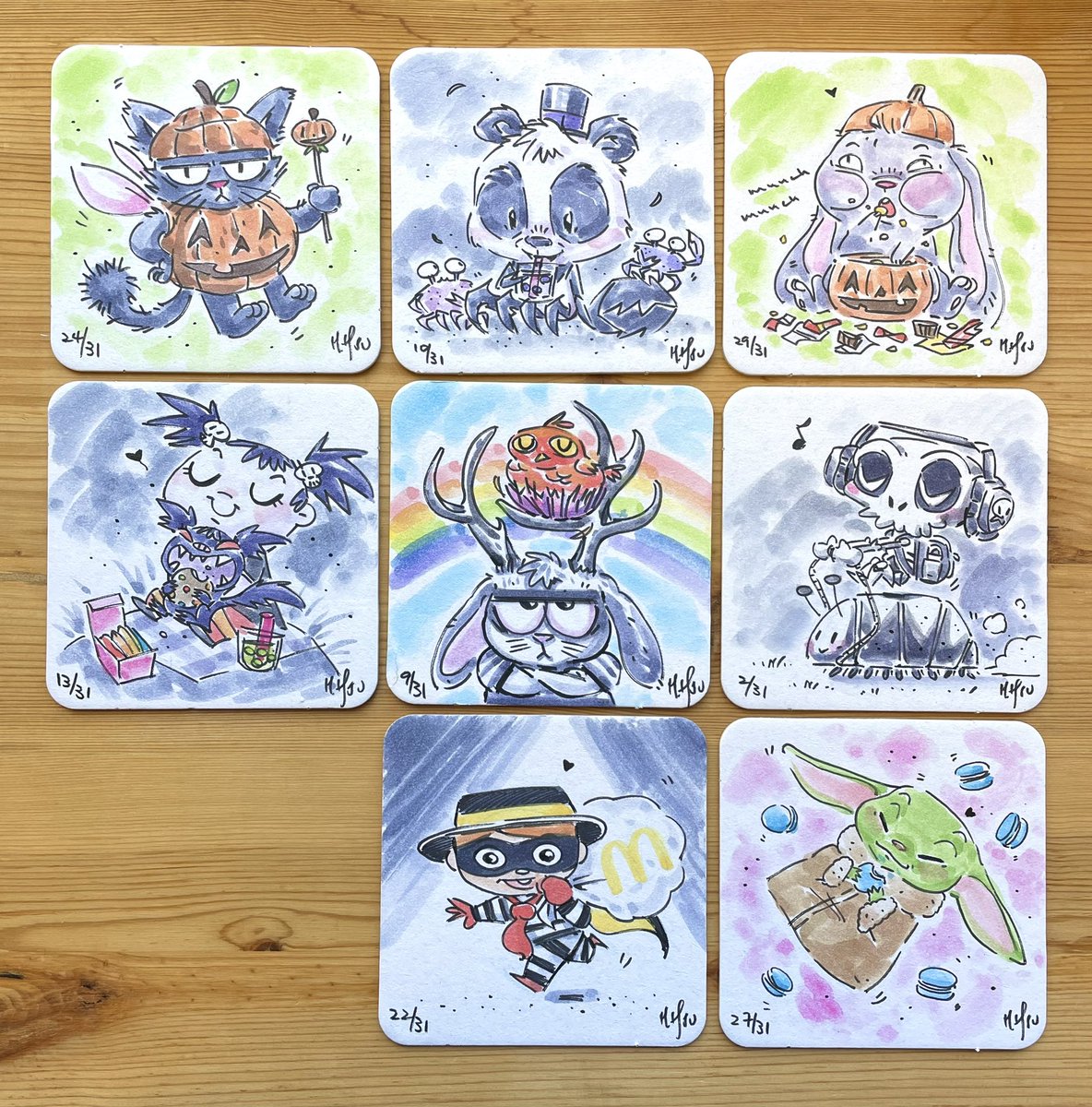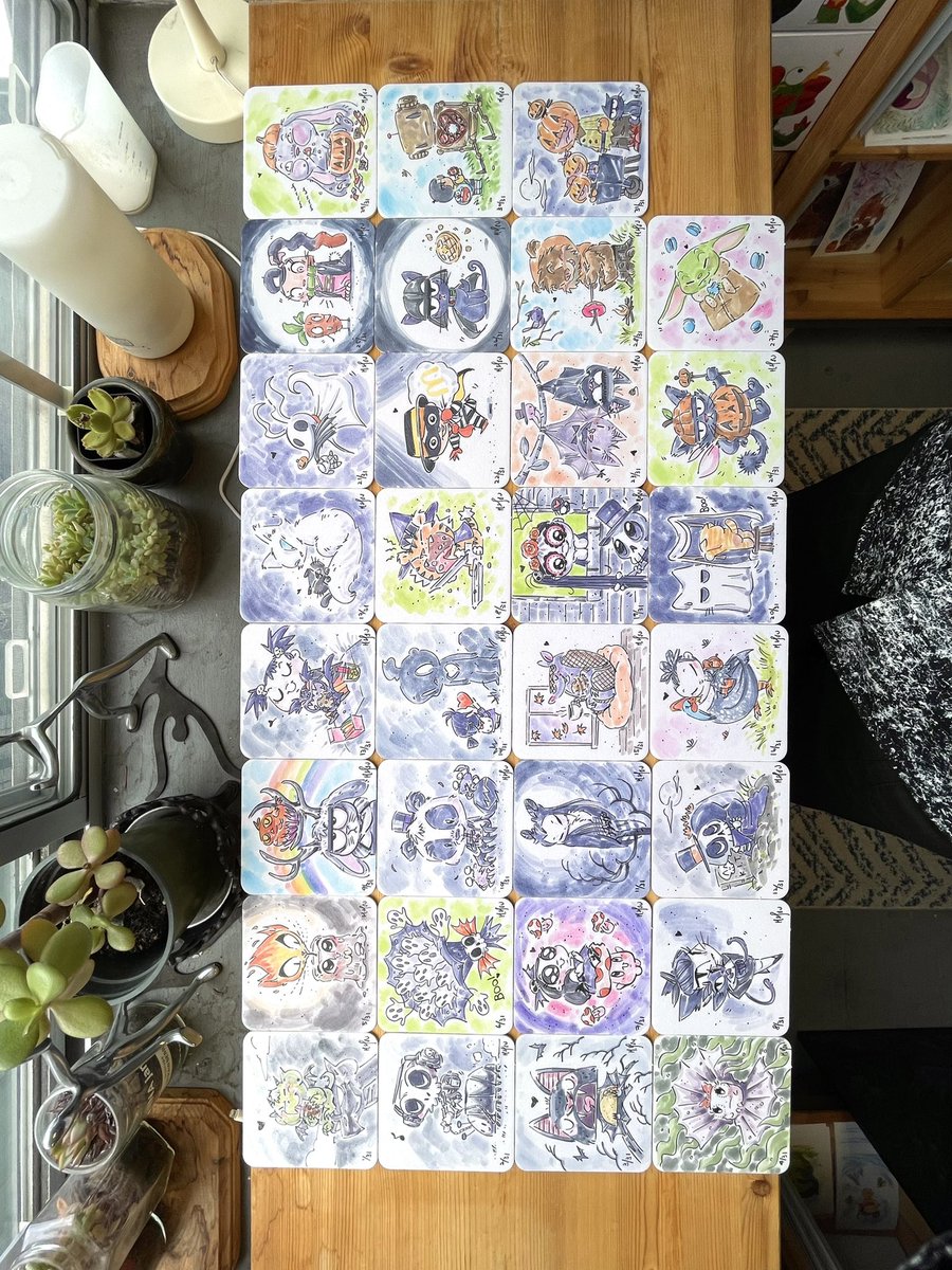 #Inktober2022 completed! Phew, what a marathon. Really happy I stuck to it and took a break when I wasn’t feeling inspired. Inking and painting on these 4x4” coasters has been great fun. They look nice all together! Until next year? 😅 #inktober Happy #Halloween ! 🎃👨🏻🎨