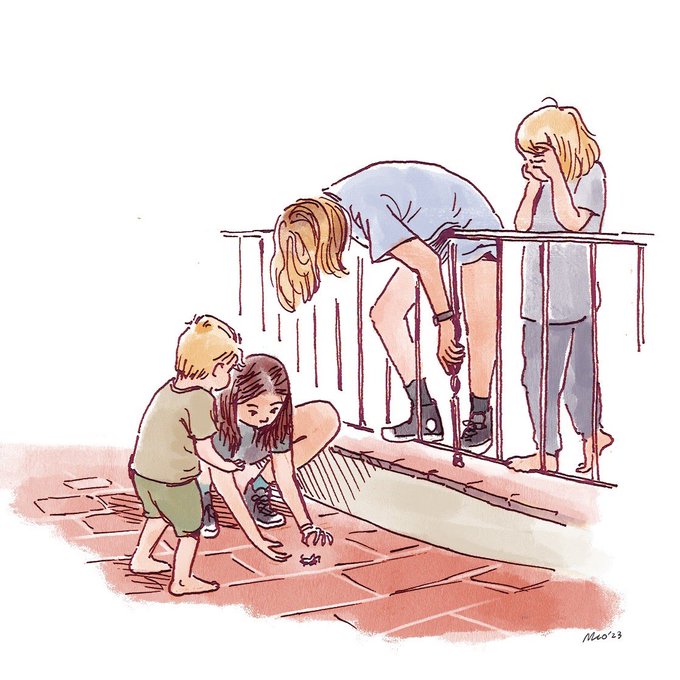 Moment observed: a group of kids captivated by a grasshopper outside a restaurant. Hope everyone has a relaxing Memorial Day holiday. #kidcharacter #sketchbook #inkdrawing #kidlitart #childrenillustration #illustration