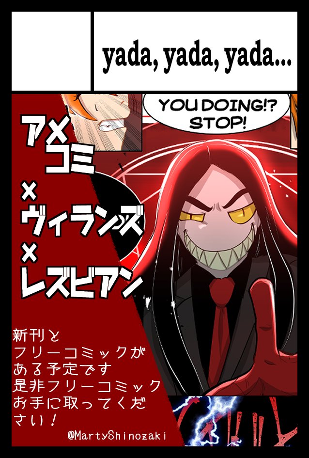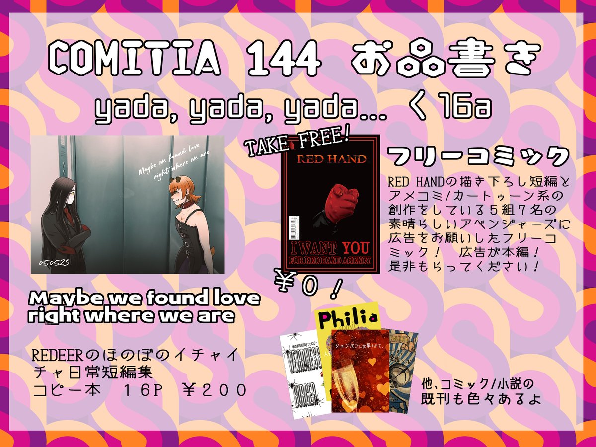 #COMITIA #コミティア144 #COMITIA144お品書き アメコミ/カートゥーンな世界観でスーパーヴィランのビアンカップルがイチャつく(イチャつくとは言ってない)創作をしています。当日はフリーコミックがあるので是非貰ってください! yada, yada, yada... く16a