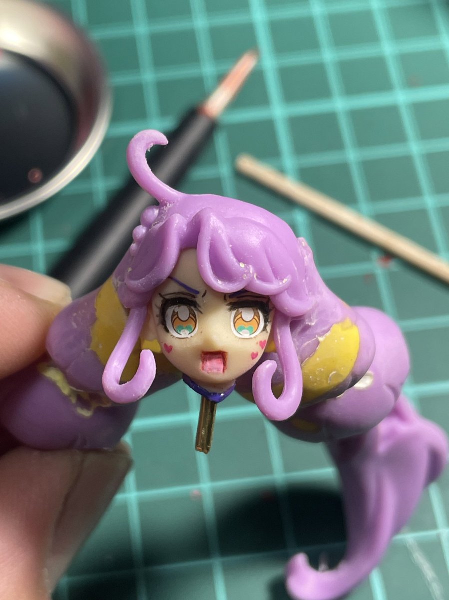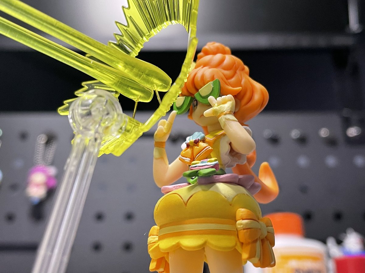 キューティーフィギュア キュアパパイア(ビーム発射Ver)完成です! 2個分用意し指や脚を改造してポーズを変更、特徴的なイヤリングはプラ板を塗装して再現し、エフェクトパーツはガンプラのビームサーベル、カスタマイズエフェクトを真鍮線で接続してそれっぽくしました! #キューティーフィギュア