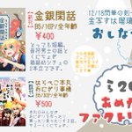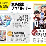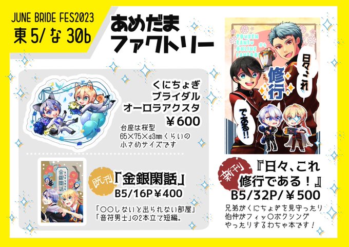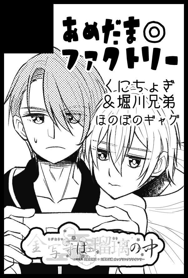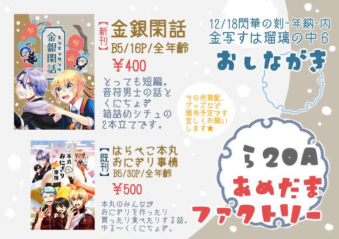 12/18金瑠璃6のおしながきです! ら20a/あめだまファクトリー 新刊「金銀閑話」(くにちょぎ短編)pixiv.net/artworks/10361… 既刊「はらぺこ本丸おにぎり事情(再販)」 pixiv.net/artworks/99821… 新刊は先着でノベルティあります(表紙絵ポスカ) 間に合えば無配(漫画等)何種類か置き…たい! 何卒! twitter.com/Maruoka_10rb/s…