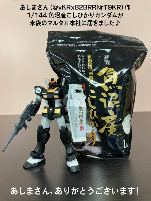 何と!以前の私のツイートを見て、ご自身でも1/144魚沼産こしひかりガンダムをお作り頂いた、あしまさん @vKRxB2BRRNrT9KR が大切な作品を米袋のマルタカ本社にお送り頂きました!元ネタの米袋とツーショット!ガンプラ好きの絆に驚きと感謝です!😆 #ガンプラはどんな自由な発想で作ってもいいんだ twitter.com/MarutakaShop/s…