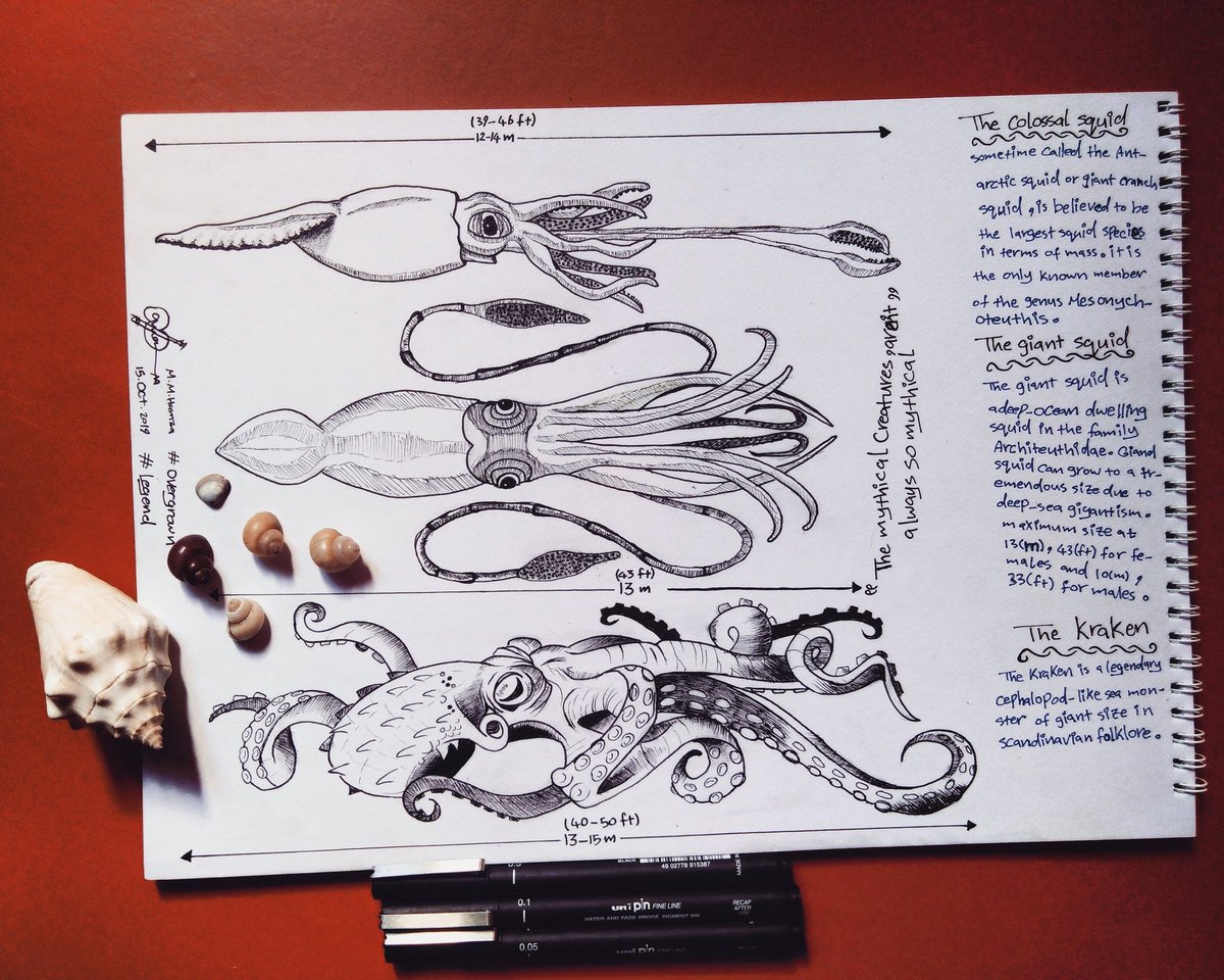 #inktober2019 #inktobersudan #inktober Day (14): overgrown + Day (15): legend "the mythical creatures aren't always so mythical" 1. The Colossal squid "الحبار الضخم" : 12-14 (m) . 2. The giant squid "الحبار العملاق" : 10-13 (m). 3. The kraken "الكراكن" : 13-15 (m).