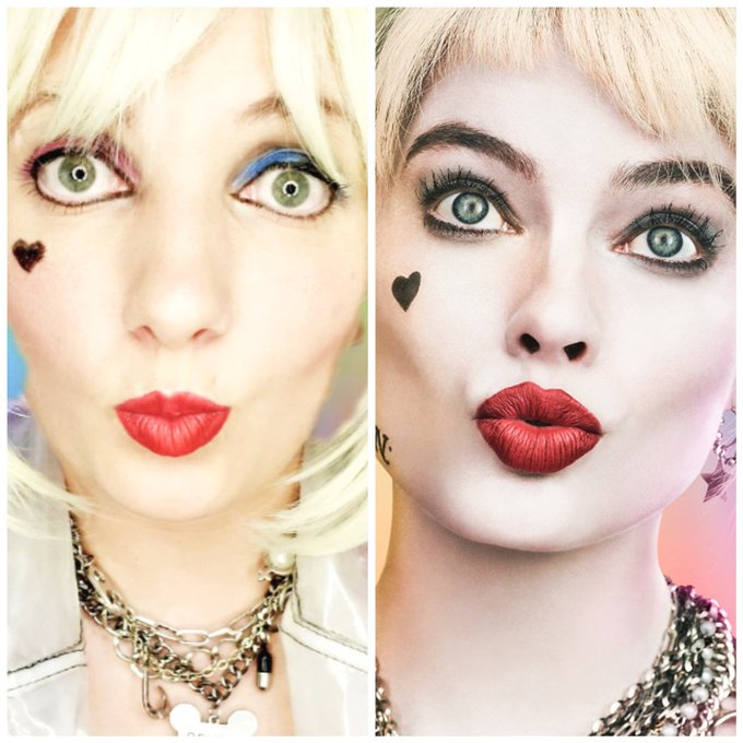 Here's a #sidebyside of the #makeup I did of @MargotRobbie's #BirdsofPrey #HarleyQuinn. What do you think of this #comparison? . #sidebysidecosplay #cosplay #harleyquinncosplay