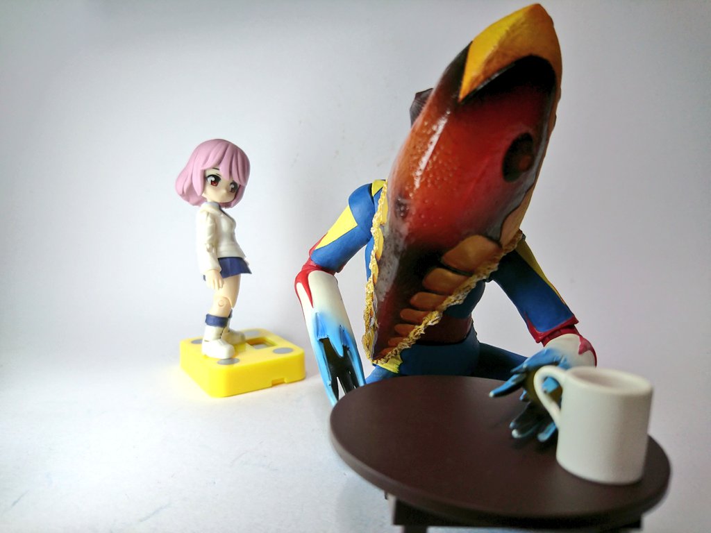 #夜のフィギュア撮影会 11/18 お題『飛』 【飛ぶ鳥(のテンション)を落とす勢い】 邪エナガ 「余は空腹じゃ!馳走を用意せい!!(美味しいもの食べたい♪) メトロン星人 「モモ~💦、なんか食いもんある~?」 ・・・ガーン!!! #コウペンちゃん #邪エナガ #駅弁フィギュアコレクション