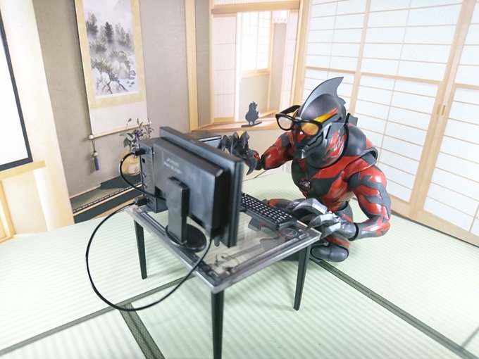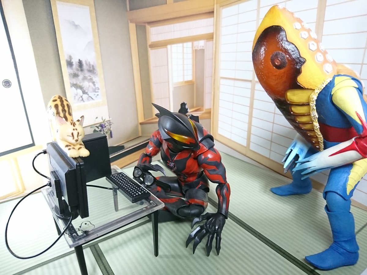 #夜のフィギュア撮影会 12/16 お題『病』 ベリアル (闇落ちに病んでまで息子にかまってもらう是が非…と、カチャカチャ…) 「君…随分な場所で寛いでるけど… そこ…、暖かいよな♥️」 メトロン 「陛下、マイコンで何されてるんです?」 「お前…マイコンて…」 #手のひらPCサプライ