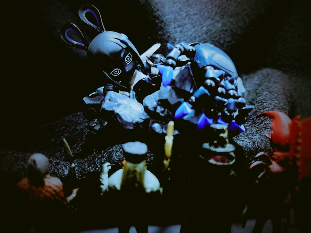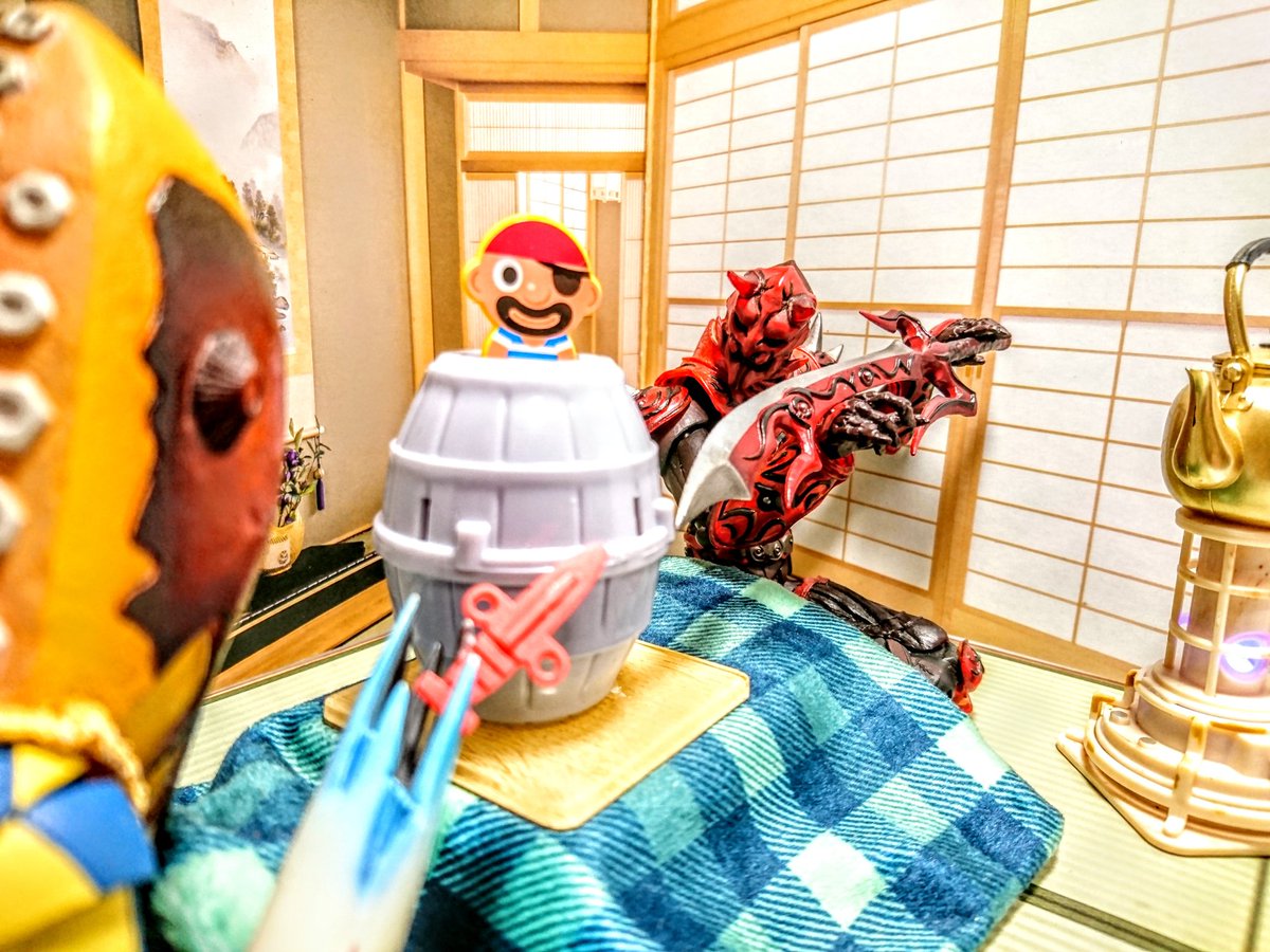 #夜のフィギュア撮影会 11/22 お題『家』 【家族】 モモタロス (メトロンとベリアルの旦那が我が家に新たな家族を連れてきた…) 邪(ヨコシマ)エナガ 「苦しゅうない!近こう寄れ!!」 (いっぱい仲良くしてね♪) チャッキー 「僕たち死ぬまで親友だからね♥️」 モモタロス (なんかヤバい…)