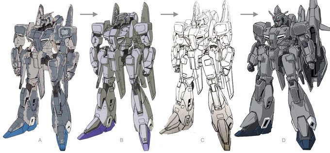 昨夜の #模型ひとり語り はゼータプラス語りだったんですが、補足画像を一つ A:モデグラ1986年12月号全身画像初出 B:ガンダムセンチネル画稿 C:マスターグレード開発画稿 D:ガンダムUC設定画稿 徐々にヒーロー体型に変化していく中で引き立つAの尖りっぷりよ。 録音版は下記リンクからどうぞー。 twitter.com/Matmat825/stat…