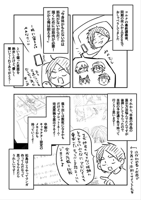 #コルクラボマンガ専科卒展 途中でキャンバスプリントとかパネル貼り付けとかちゃんとやろうか悩んだけど、やっぱ俺には漫画しかねぇ!ってなったので、普通にマンガを壁に貼ります😂ネームとかプロットのコピーも持っていくので松島が困りながら描いた軌跡を辿ってください😂 #コルクラボマンガ専科