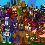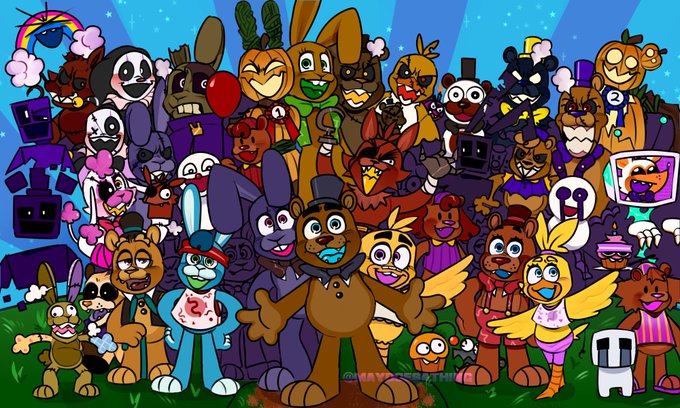 I've finished the FNAF world au art!! Everyone gathered around for one big group photo <3 #fnaffanart