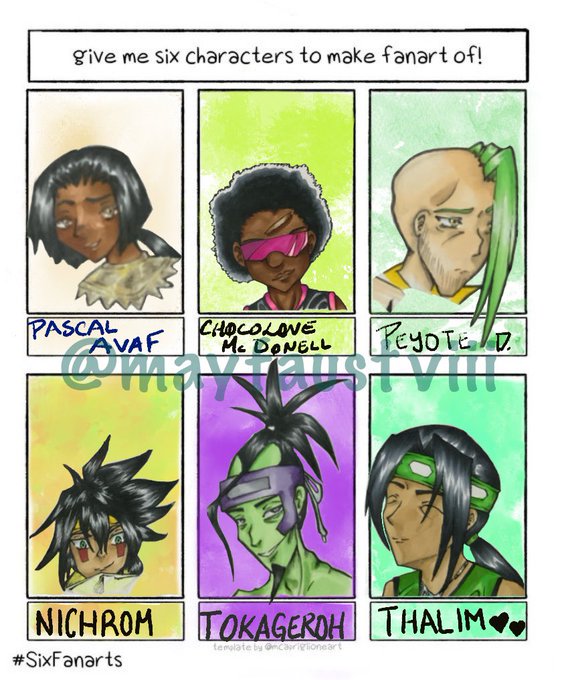 Después de 84 años, han sido semanas complicadas, Pascal @pauparches, Chocolove @ram_higa, Peyote @valeria_antonia, Tokageroh @LoveAnimeMangaX, Thalim @hojitaestelar y Nichrom #SixFanarts #SKFanart la foto mato todo, gracias! las OTP las hago luego y si quieren hay lugar aún