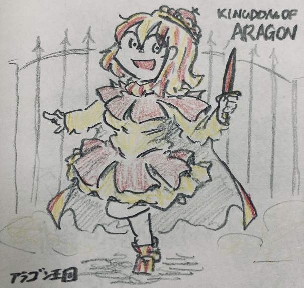 2 17 #世界史 #アナログ絵 #アナログイラスト アラゴン王国さん!カスティーリャ王国よりも地の国力は劣るものの、オクシタニア(現フランス南部)・南イタリア・北アフリカへ勢力を広げ、地中海の覇権を握りかけた実力者です。シンボルは赤と黄の縦ストライプ。 22/10/13 19:06